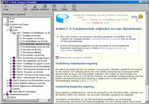Iedereen die snel op een handige manier kennis wil nemen van de volledige tekst van de Europese Grondwet kan nu gratis op deze site een E-book versie downloaden. Het PDC E-book, dat kan worden opgeslagen op de harde schijf of gebrand op cd, biedt de volgende faciliteiten: